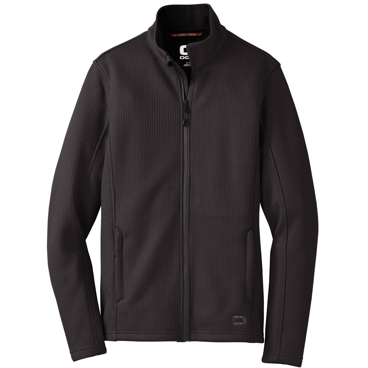 With a unique and rugged texture, this jacket shows real grit. Heavy gauge knit, an embossed lining and understated details give it a sharp take on utility and comfort. 12.4-ounce, 100% poly knit bonded to 100% poly brushed-back fleece. Zip-through cadet collar. OGIO heat transfer label for tag-free comfort. OGIO locker loop. Embossed lining with subtle O pattern. Reverse coil zipper with OGIO zipper pull. Embroidered O on front and back. Front zippered pockets. Open cuffs and hem.